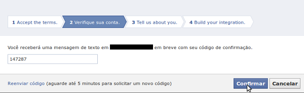 8- Digite o código que você recebeu na mensagem que foi enviada para o número de celular informado. Exemplo: (147287). Caso não receba a mensagem depois de um período longo, há a opção de reenviar o código.
