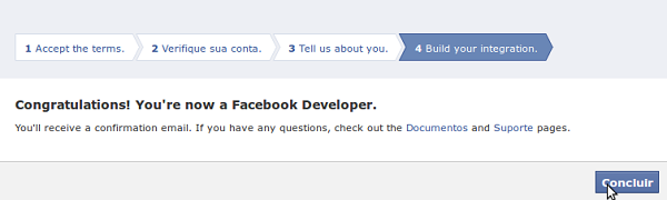 O Facebook pedirá informações sobre seus interesses em desenvolvimento. Não é necessário marcar alguma opção. Logo abaixo, há dois checkboxes marcados por padrão. Caso não queria receber notificações por e-mail sobre a área de desenvolvimento do Facebook ou curtir a página dos desenvolvedores, você poderá desmarcá-las.