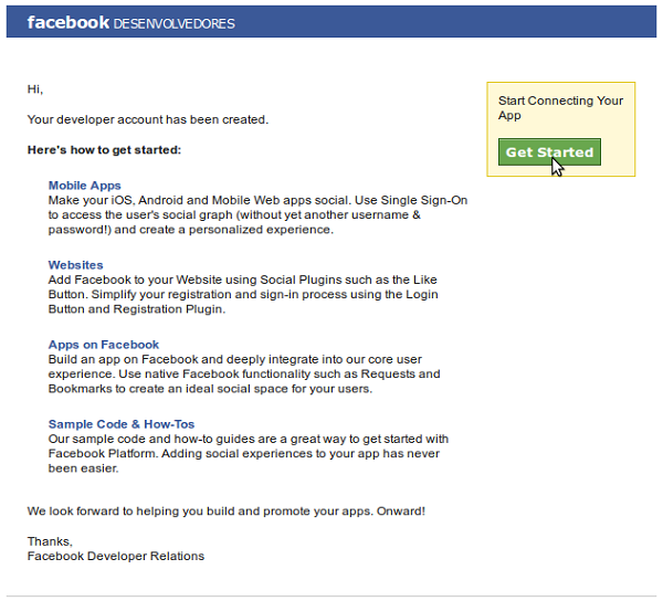 12- Será enviado um e-mail de confirmação. Verifique o e-mail recebido e, nele, clique em Get Started.