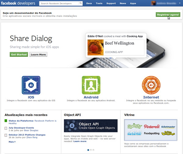 4- Clique em Registrar agora. Caso este botão não apareça, basta pular para a próxima sessão do tutorial, Criar Aplicativo .