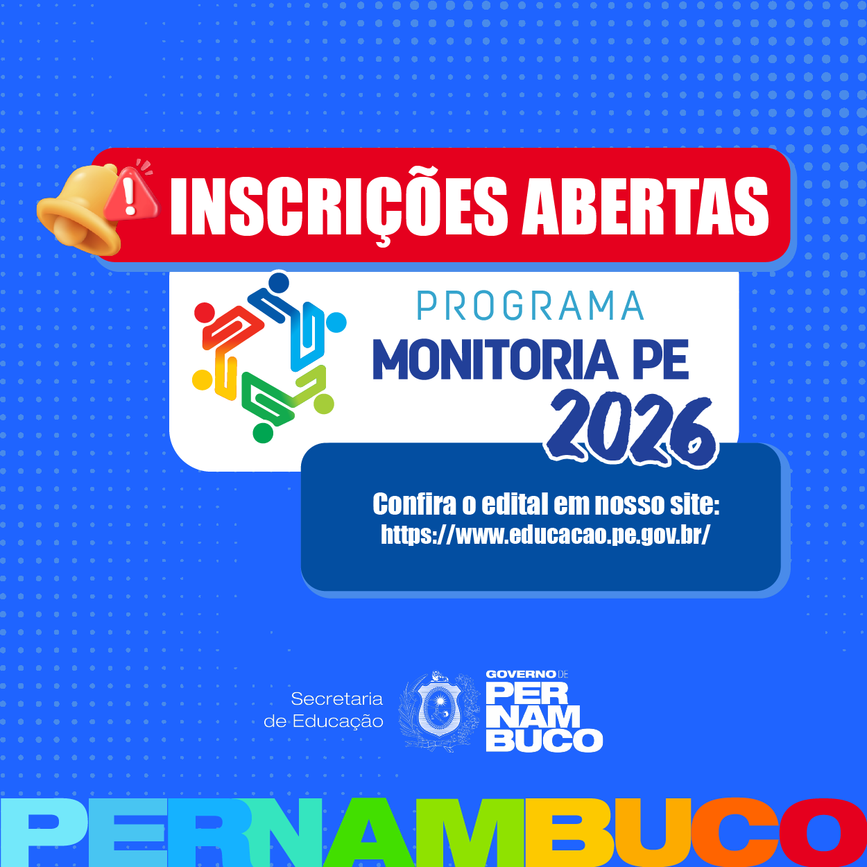 Estão abertas as inscrições para o Programa Monitoria PE, iniciativa do Governo de Pernambuco, por meio da Secretaria Estadual de Educação (SEE), que oferece bolsas remuneradas a estudantes da rede pública estadual para atuação como monitores de aprendizagem. O programa tem como objetivo potencializar o desempenho escolar dos alunos, fortalecendo o processo de ensino e aprendizagem por meio do apoio entre colegas, tornando o acompanhamento pedagógico mais próximo, colaborativo e eficaz dentro das unidades de ensino.