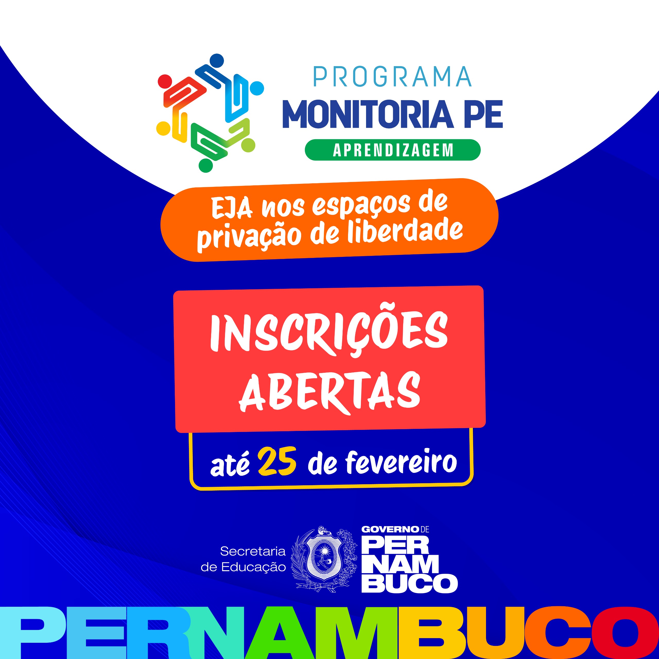 A Secretaria de Educação do Estado (SEE) abriu, nesta sexta-feira (20), as inscrições para o processo seletivo do Programa Monitoria PE – Aprendizagem da Educação de Jovens e Adultos (EJA) nos espaços de privação de liberdade. O Objetivo do certame é selecionar estudantes do Módulo VIII dos anos finais do ensino fundamental, do 3° Módulo (EJA Médio) ou de nível superior em áreas afins da educação para exercerem a monitoria nos componentes curriculares de matemática e língua portuguesa para os alunos das turmas existentes nas escolas. Os interessados devem se inscrever nas secretarias das unidades de ensino até o dia 25 de fevereiro.